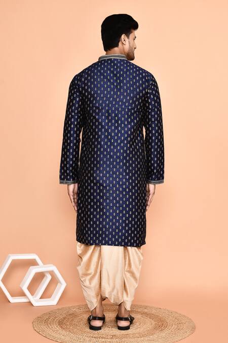 Navy blue kurta featuring miniature mandala embroidered buttis with a stand collar and full sleeves. Paired with a beige dhoti pant for a complete look.