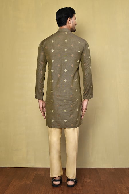 Army green plus print straight kurta featuring a collared neck and full sleeves. Paired with a beige elastic pyjama for a complete look.