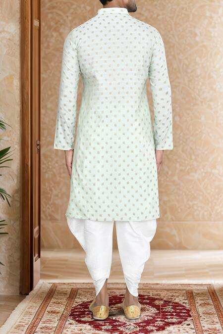 Green woven kurta featuring a band collar and buttoned placket. Paired with an off-white patiala made of art silk.