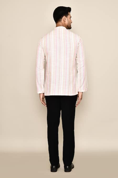 Floral embroidery on stripe pattern, Front placket with buttons, Mandarin collar design