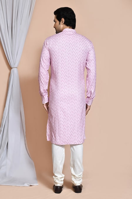 Pink kurta featuring full sleeves, mandarin collar, and thread embroidery in stripe pattern. Paired with white churidar featuring an elasticated waistband.
