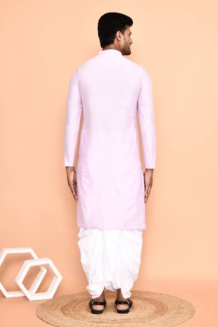 Purple straight kurta featuring a metallic embroidered yoke. Paired with a cream dhoti pant made from art silk.