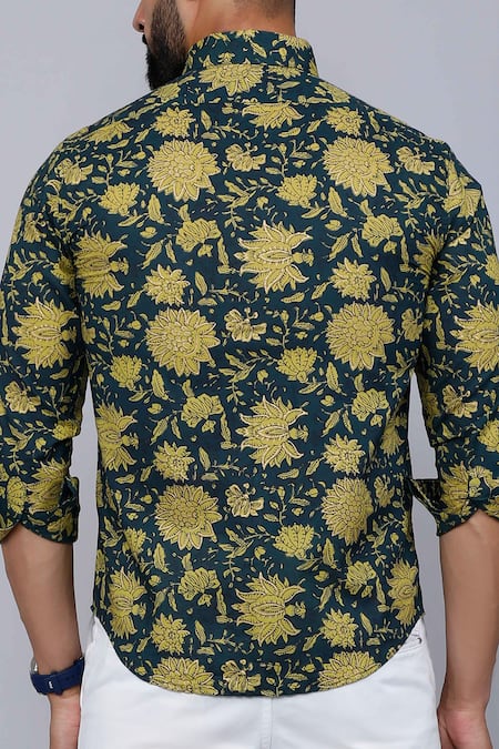 Green shirt featuring floral motifs and vine print with front pocket detailing