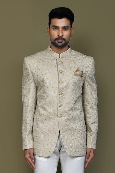 Pista green bandhgala featuring full sleeves and thread embroidery in hexagon pattern