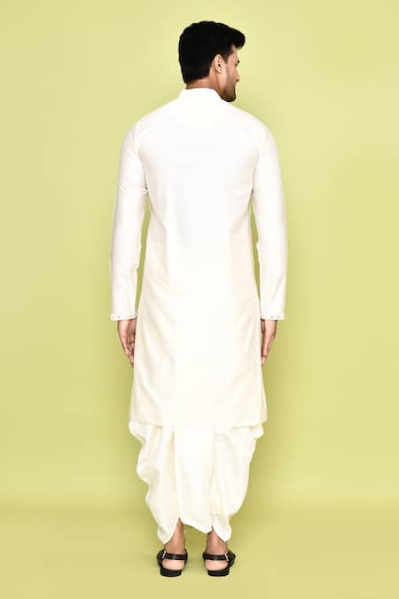 Beige kurta featuring full sleeves, band collar, and intricate thread and mirror embroidery. Paired with an art silk dhoti pant for a complete look.