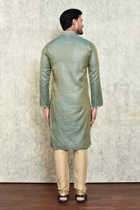 Firozi blue jacquard kurta featuring embroidery along the placket and collar. Paired with a gold churidar in poly cotton fabric.