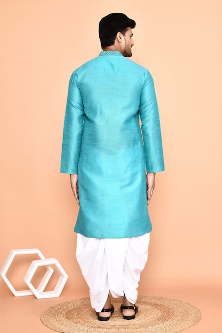 Light blue kurta featuring thread embroidery with a band collar and full sleeves. Paired with a cream dhoti pant for a complete look.
