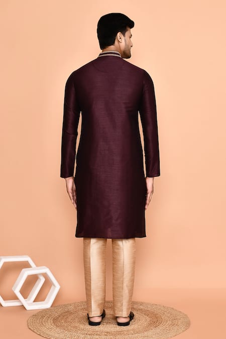 Brown kurta featuring placed thread embroidery on the yoke and collar. Paired with beige plain pants for a complete look.