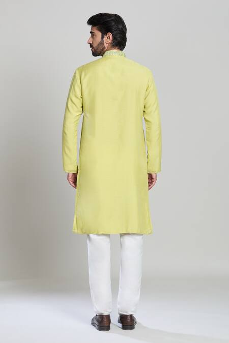 Lemon green kurta featuring a mandarin collar with mirror and thread embroidery on the neckline. Paired with contrast cream solid pant.