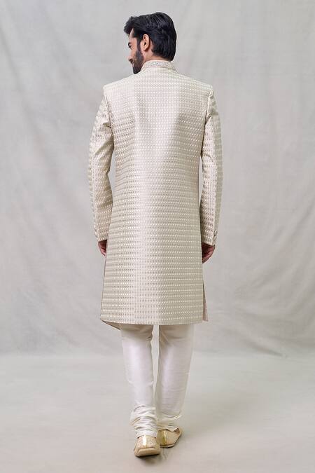 Light beige sherwani featuring thread embroidery and a mandarin collar. Paired with a cream churidar made of dupion art silk.