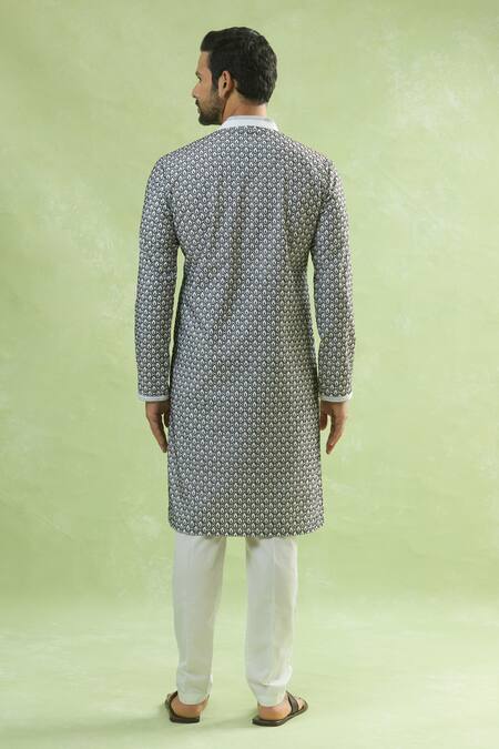 Black and white kurta featuring geometric thread embroidery with a band collar