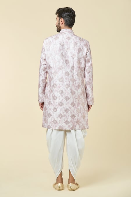 Pink kurta featuring sequin and thread embroidery with a band collar. Paired with a white peshwari pant made from art silk.