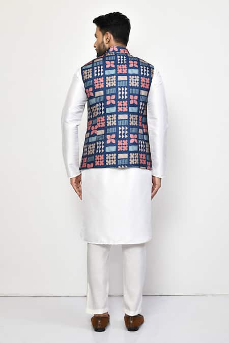 Blue bundi featuring thread embroidery in geometric and floral patterns. Paired with a white full sleeve kurta and pant.