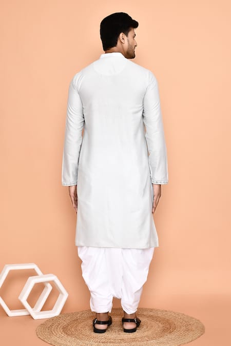 Grey kurta featuring thread and mirror embroidery with a band collar and full sleeves. Paired with cream art silk dhoti pant.