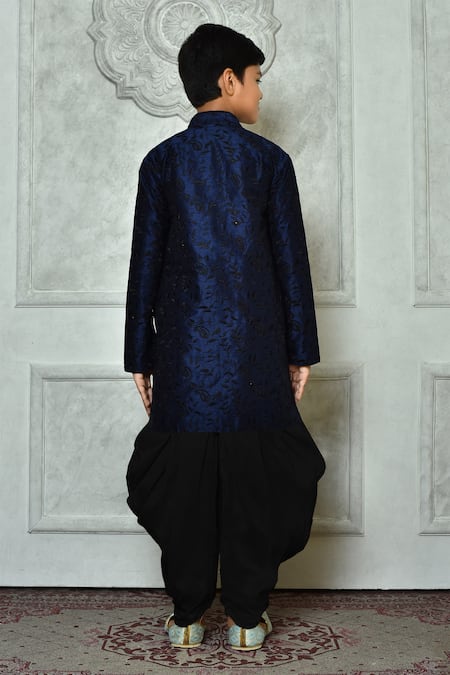 Navy blue kurta featuring leaf and paisley thread work with a mandarin collar. Paired with a black patiala pant for a traditional look.