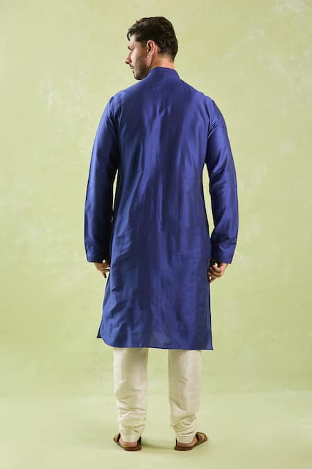 Blue kurta featuring tonal swirl threadwork placket. Paired with a churidar in art silk fabric.