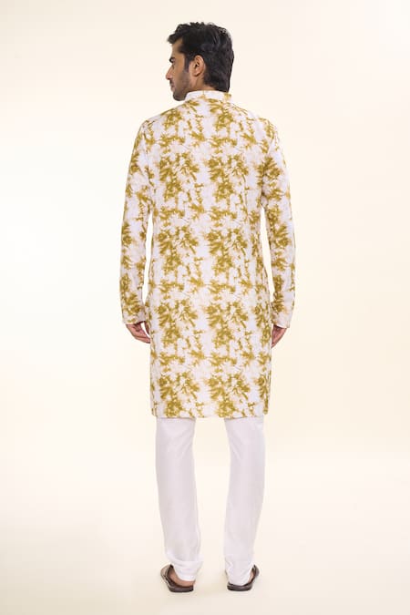 Yellow kurta featuring full sleeves and a band collar with a tie dye splash print. Paired with a white churidar for a complete look.
