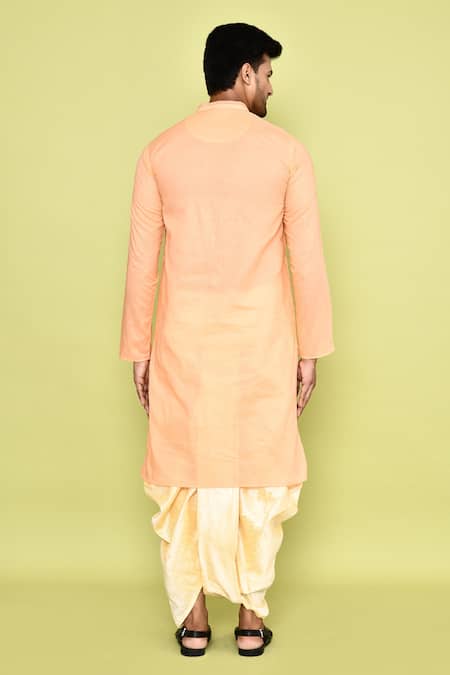 Pink straight kurta featuring a floral embroidered placket. Paired with an off-white draped dhoti pant made of art silk.