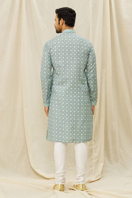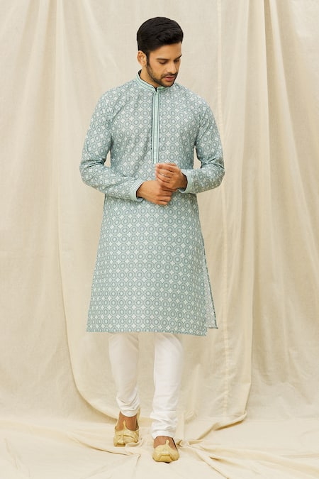 Teal green straight kurta featuring a Mandarin collar and full sleeves