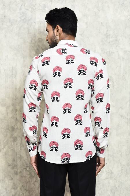 White shirt featuring long sleeves and collar neckline with an all-over turban man print