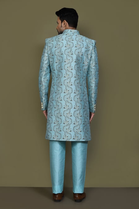 Buy_Arihant Rai Sinha_Blue Jacquard, Silk Sequins Vine Bloom Layered Sherwani With Aligadhi Pant
