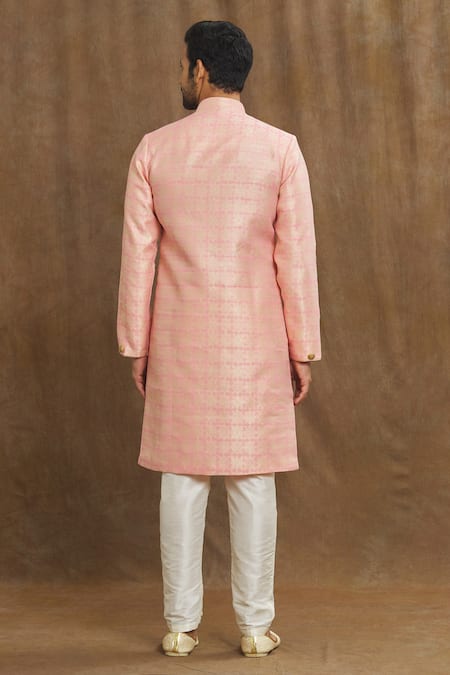 Pink kurta featuring a vintage woven pattern and thread work, complemented by a mandarin collar and full sleeves. Paired with cream dupion art silk Aligardhi pants with side pockets.