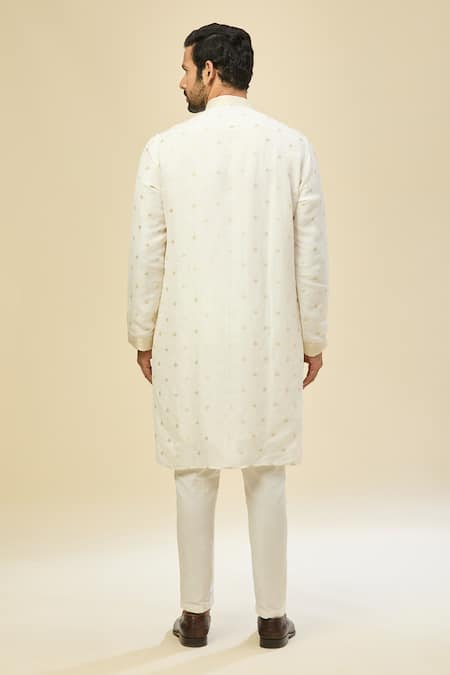 White kurta made from Benaras silk featuring intricate weave work. Paired with off white cotton polo pants.