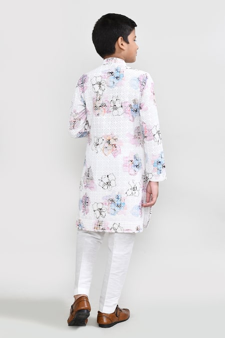 White kurta featuring full embroidery with floral patterns. Paired with matching white art silk pants.