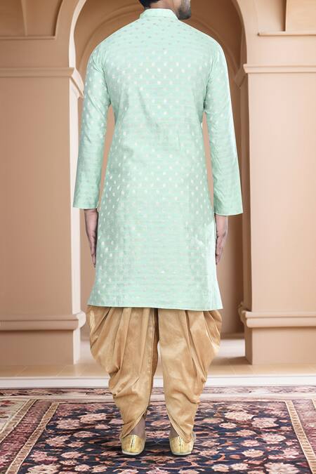Green woven kurta featuring a band collar and buttoned placket. Paired with a gold patiala made from art silk.