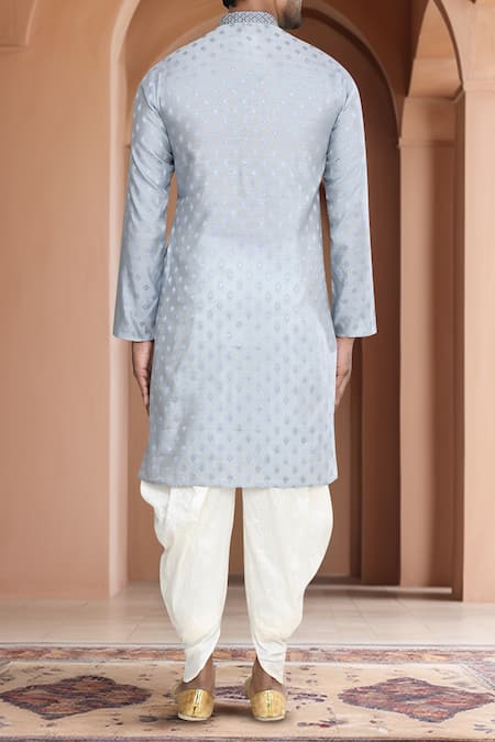 Grey kurta featuring a woven ethnic motif with a band collar and full sleeves. Paired with off-white patiala pants with an elastic waistband.