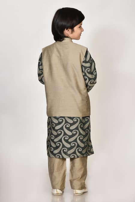 Woven kurta with side slits and full sleeves. Paired with a light brown sleeveless bundi and straight pants featuring a semi-elasticated waistband.