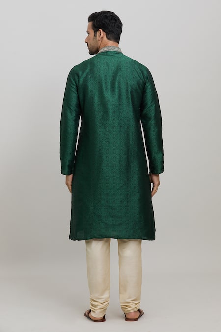 Green woven kurta featuring a band collar and embroidered placket. Paired with an elasticated churidar with side seam pockets.