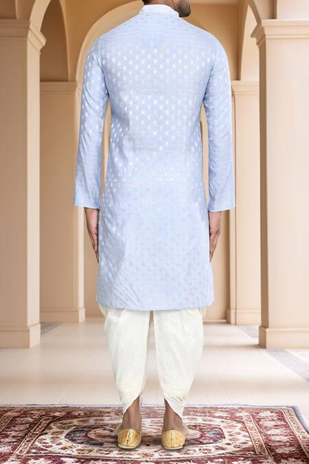 Sky blue woven brocade kurta featuring a band collar and buttoned placket. Paired with an off-white patiala made from art silk.