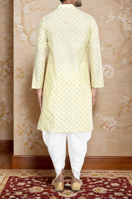 Yellow woven brocade kurta featuring a band collar and long sleeves. Paired with an off white patiala made from art silk.