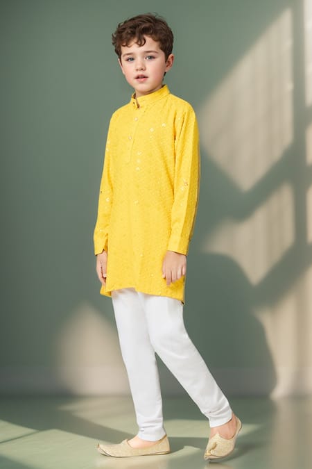 Yellow straight kurta crafted in cotton featuring thread and sequin embroidery in geometric floral pattern. Paired with a solid white churidar with elasticated waistband.