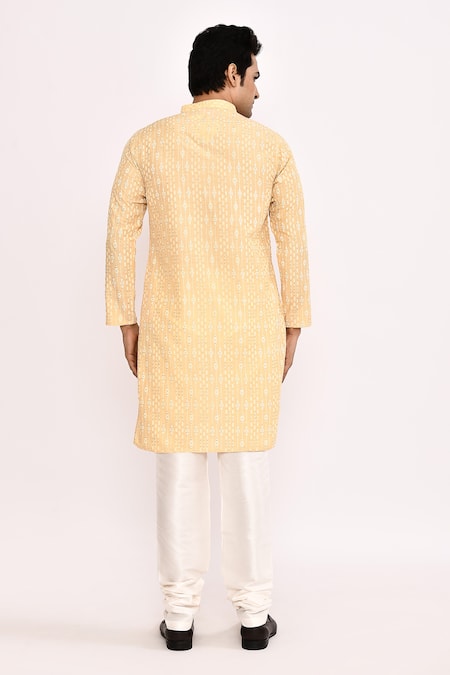 Yellow embroidered kurta made from cotton silk featuring a button placket and long sleeves. Paired with white silk bottoms for a complete look.