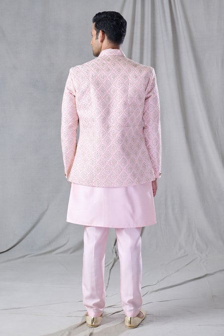 Pink full sleeve jacket featuring intricate zari and thread embroidery. Paired with a coordinating kurta and pant, crafted from a silk blend fabric.