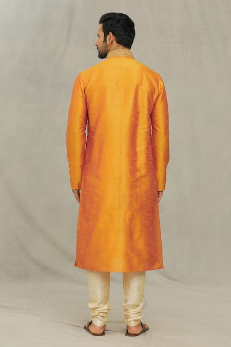 Orange kurta featuring a zari embroidered placket and full sleeves. Paired with a beige churidar made from dupion silk.