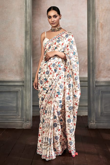 With spring flower prints strewn over a deliciously soft fabric, this ecru saree makes for a striking traditional wear. Comes with unstitched blouse fabric.