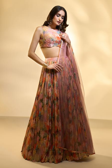 Multi Color Tissue, Net Sequins, Abstract Floral Print Pleated Lehenga Set