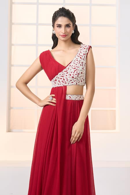 Red Chiffon, Silk Embroidery, Tassels Asymmetric Draped And Bustier With Lehenga