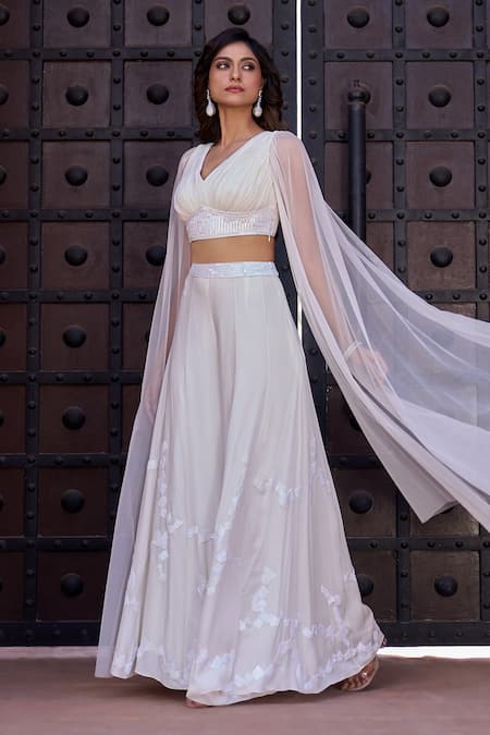 Ivory gathered bustier blouse featuring tonal sequins and beaded embroidery with an attached soft net trail drape. Paired with a tonal embroidered flared sharara made from double georgette.