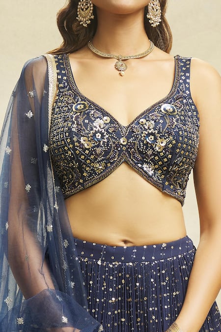 Navy blue lehenga crafted in georgette featuring sequin embellishments and attached cancan. Paired with a hand embroidered padded blouse in silk and a net dupatta.