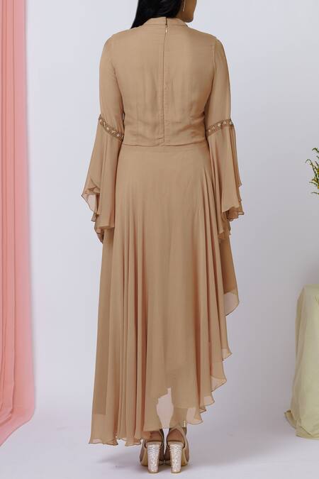 Brown draped kurta featuring a high round neck and full bell sleeves