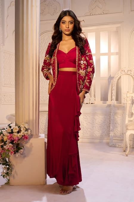 Red Silk Organza, Satin, Lycra, Crepe Embroidery Open Jacket And Draped Skirt Set