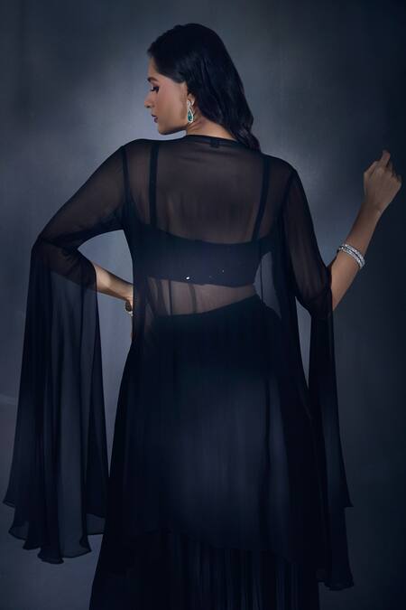 Black lehenga featuring pleats and an attached cancan. Paired with a padded embroidered blouse and an embroidered border cape jacket.