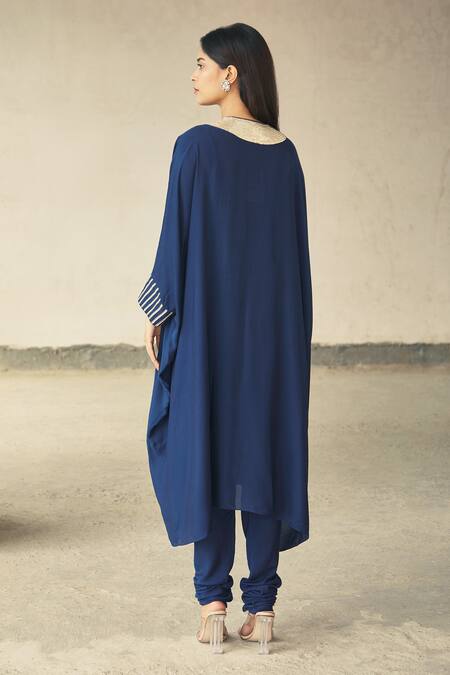 Navy blue kaftan featuring batwing sleeves, split neck, and glass pipe embroidered yoke. Paired with churidar and slip made of cotton silk and mulmul fabrics.