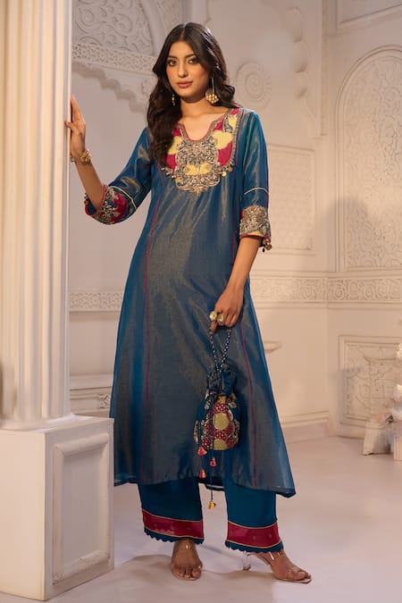 Peacock blue kurta featuring multi-colored embroidered yoke and sleeve cuffs. Paired with matching pant and potli bag.