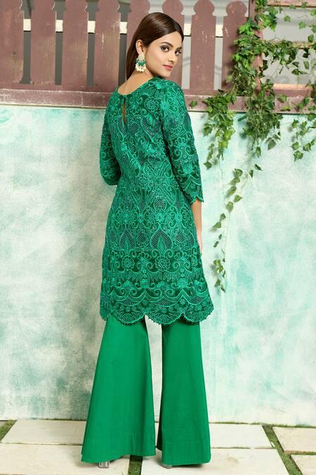 Emerald green kurta featuring tonal thread, sequin and cutdana embroidery. Paired with a matching sharara, this set is designed for comfort and elegance.