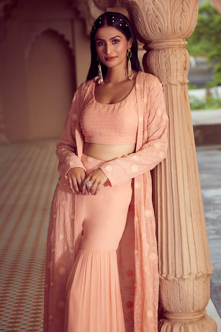Peach bustier featuring scoop neckline and pearl embellishments. Paired with a longline jacket and flowy sharara with pintucked details.